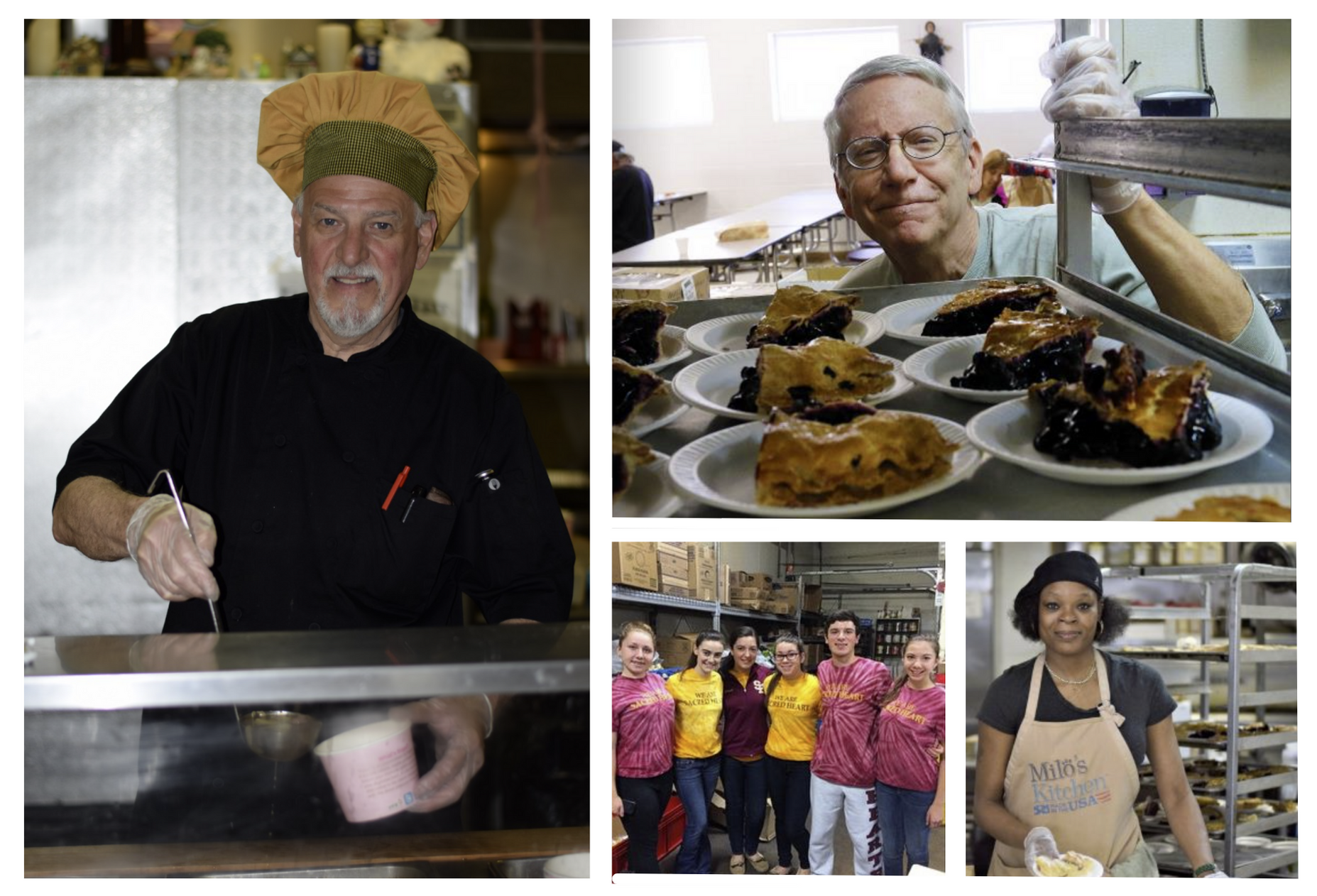 Left image: Chef Phil (staff) serving soup at the St. Vincent DePaul Mission soup kitchen. Three right images: Various community volunteers serving food. This Waterbury location has a commercial kitchen allowing for an upcoming culinary training program that will enable people experiencing homelessness to develop skills to re-enter the workforce.